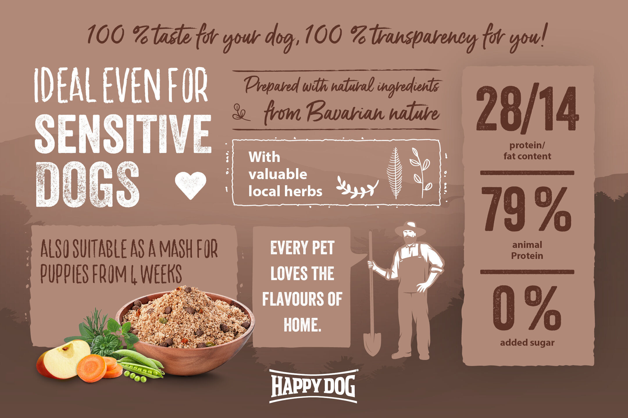 ***For mixed feeding with Happy Dog wet food, please note: 100g wet food corresponds to roughly 20 g Flocken-Vollkost.