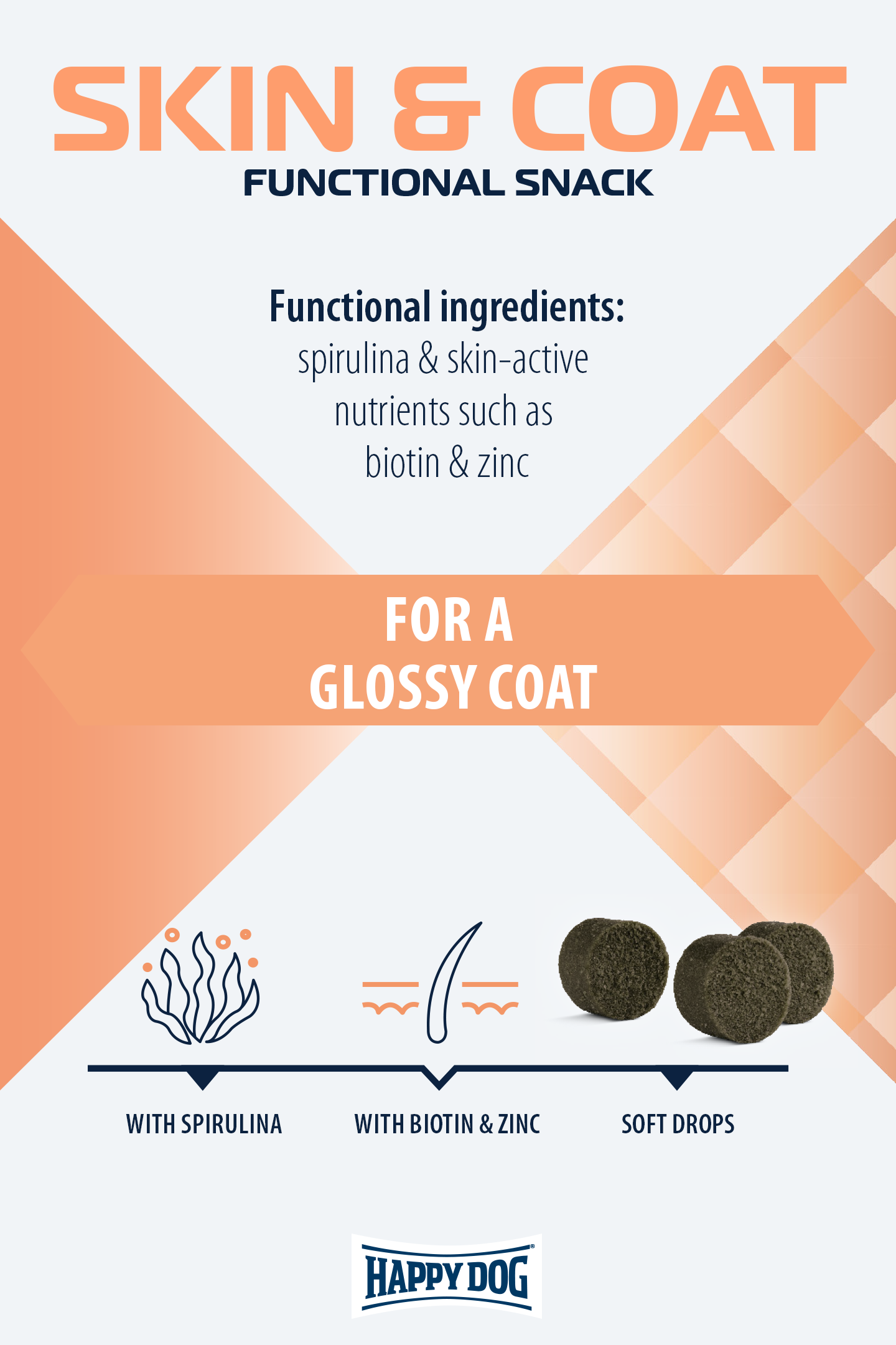 Silky shiny coat - what dog owner doesn't want that? Enriched with the skin-active nutrients biotin and zinc, as well as the nutrient-rich spirulina algae and the addition of algae oil, which provides essential fatty acids, the grain-free dog treats support the natural skin function and a shiny coat. The soft drops of this functional dog snack are easy to handle and perfect to dose. Our dog treats are made with no added sugar and no artificial flavours, colours or preservatives.