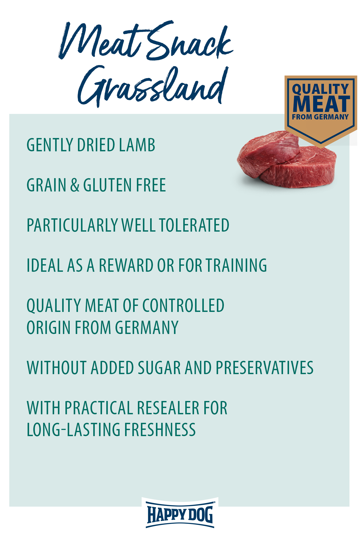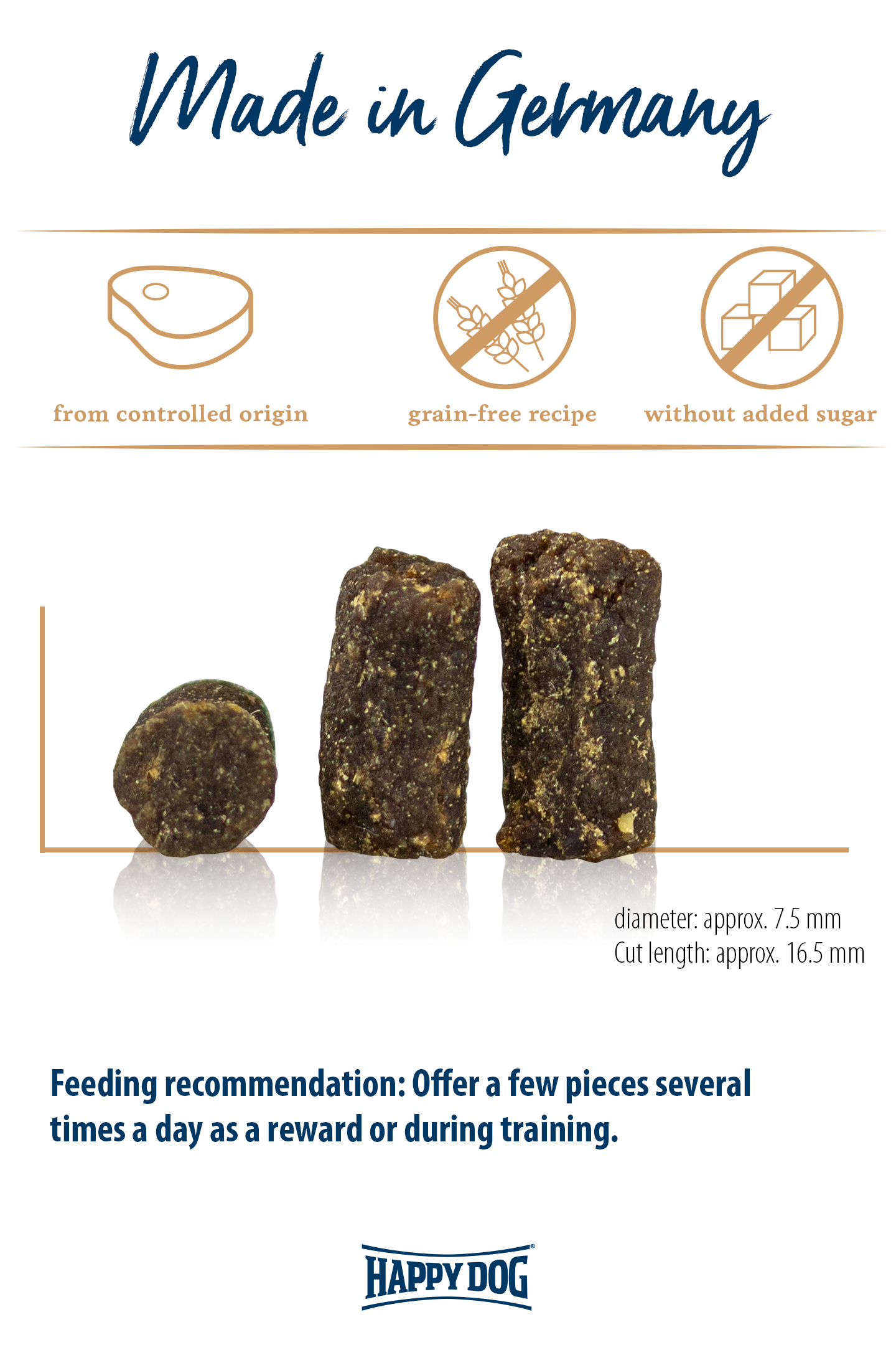 This very wholesome and easily digestible snack, with gluten-free potato, is ideal for dogs of all sizes who have sensitive digestion or are hard to please. The snacks are easy to break into pieces, which makes them perfect for training your dog or just as a reward for in-between times. The bag has a handy seal for long-lasting freshness, and the snacks are preservative-free and made with no added sugar. Sustainable, responsible business practices and top quality comes first with us, so we ensure that the meat for our Meat Snacks comes from reputable breeders in Germany, is transported the shortest possible distance, and is processed with care.