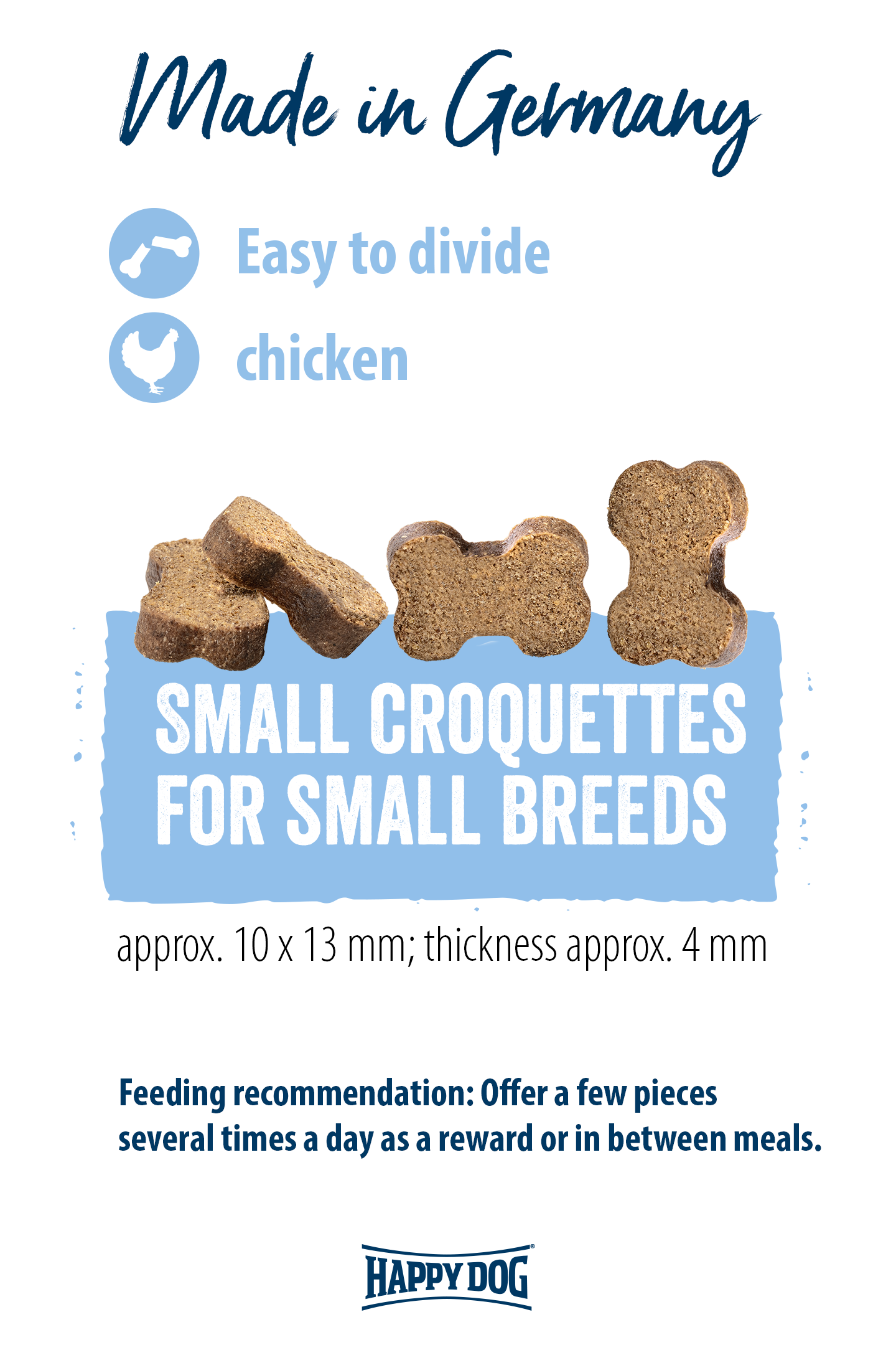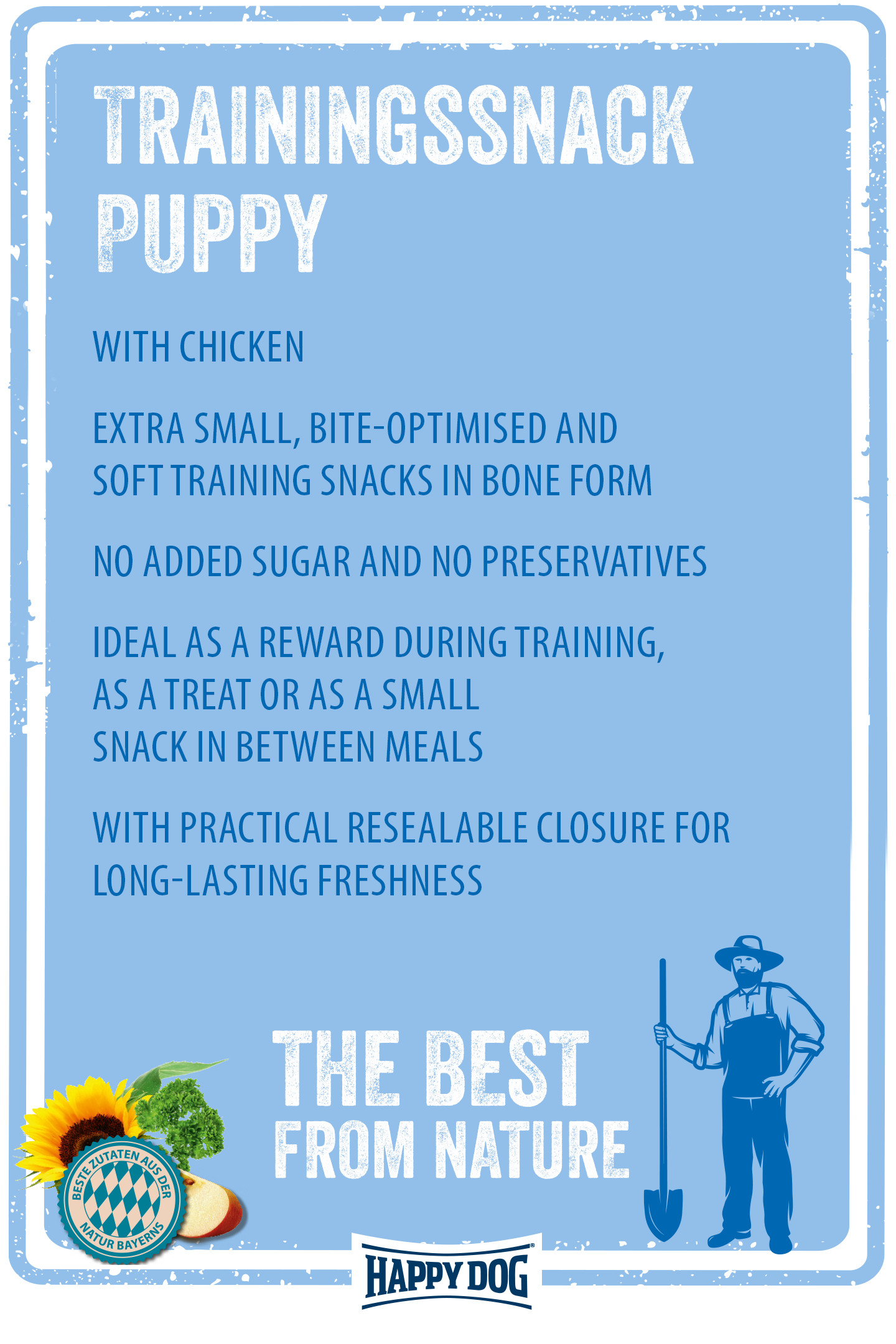 Have you just had a tiny puppy move in, turning your world upside down in no time at all? Puppies are sweet and clumsy and take up hours of your time watching them find their way about. But after a short familiarisation phase you need to get started on the training and reward your little dog for positive behaviour. Our Happy Dog NaturCroq Mini Puppy Snacks are just made for this. With these highly digestible puppy treats as a training reward, your little dog will quickly learn his first commands.