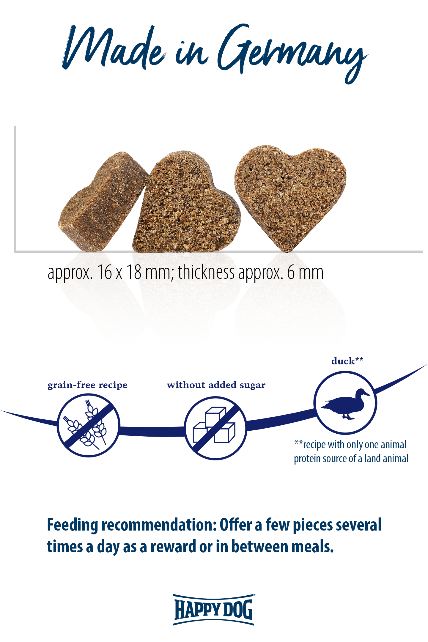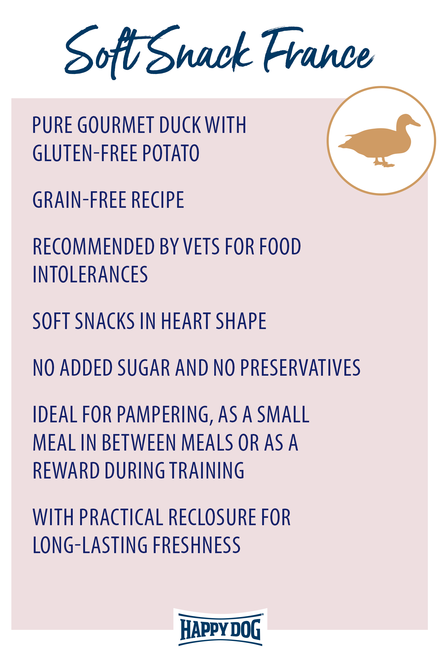 The soft, heart-shaped Snack France is perfect for pampering your pet or as a little meal for in-between times. Tasty gourmet duck enhanced with gluten-free potato gives your hard-to-please gourmet pet a real taste experience. The grain-free snack is ideal for sensitive or hard-to-please dogs from medium and large breeds, and is vet-recommended for food intolerance. The snacks are made with no added sugar and are preservative-free, and the bag has a handy closure for long-lasting freshness. Enjoyment guaranteed!
