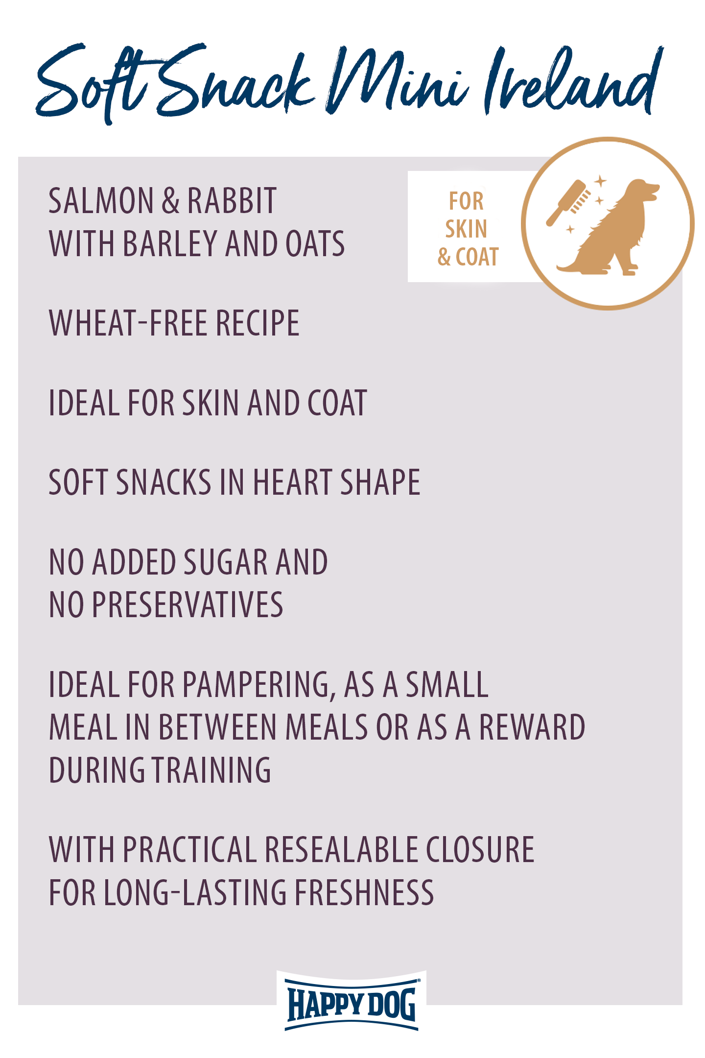 With a treat in your hand, you will quickly draw your little pet’s attention to you. Of course you can make tasty snacks yourself for your four-legged friend, but alternatively you can rely on our delectable Soft Snacks Mini Ireland. Our treats in the practical resealable pouch are made from salmon and rabbit. And our food contains no added sugar or artificial preservatives as a matter of principle. Omega 3 and 6 fatty acids help to give your little dog a glossy coat. So you can delight your pet during training or at any time just because.