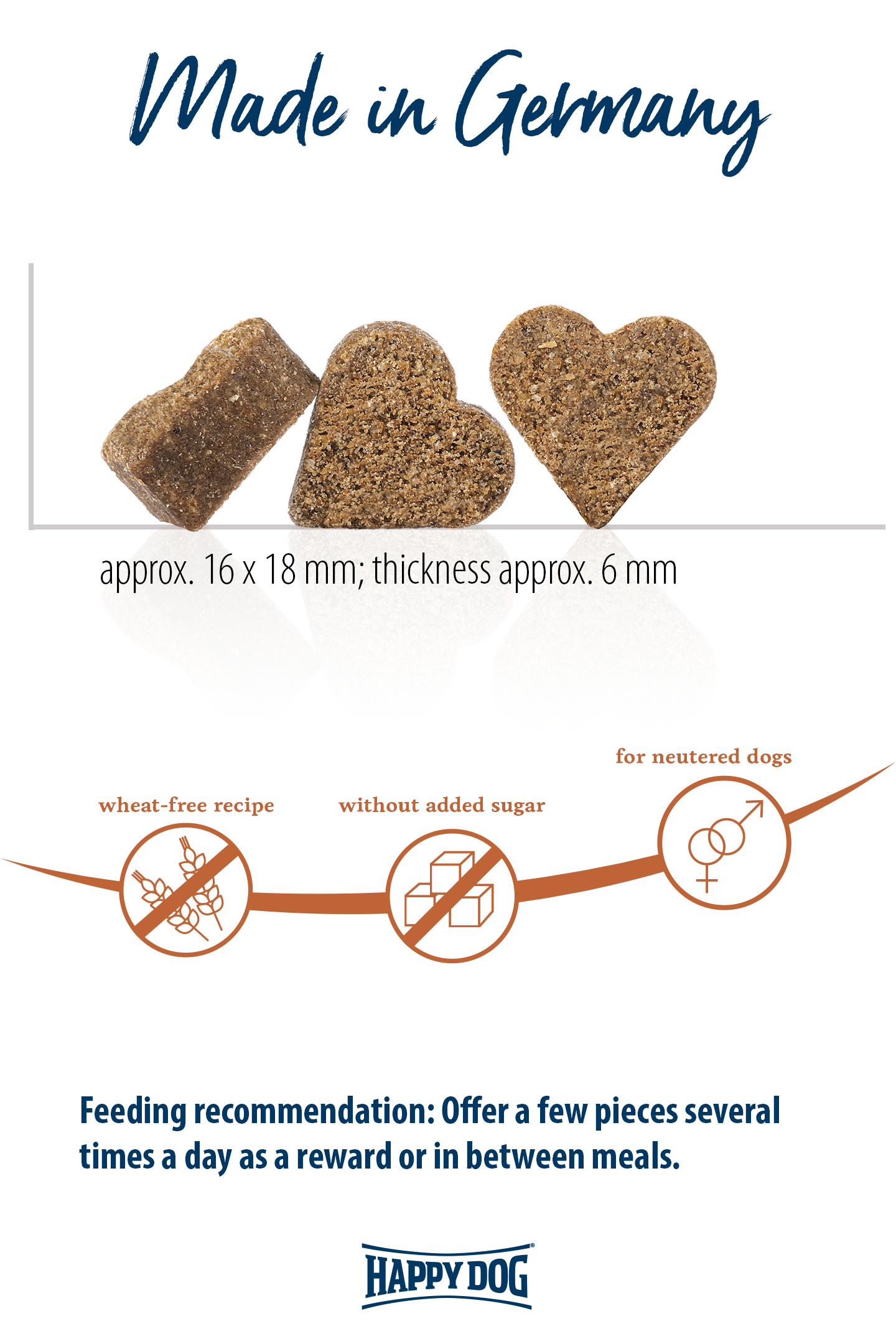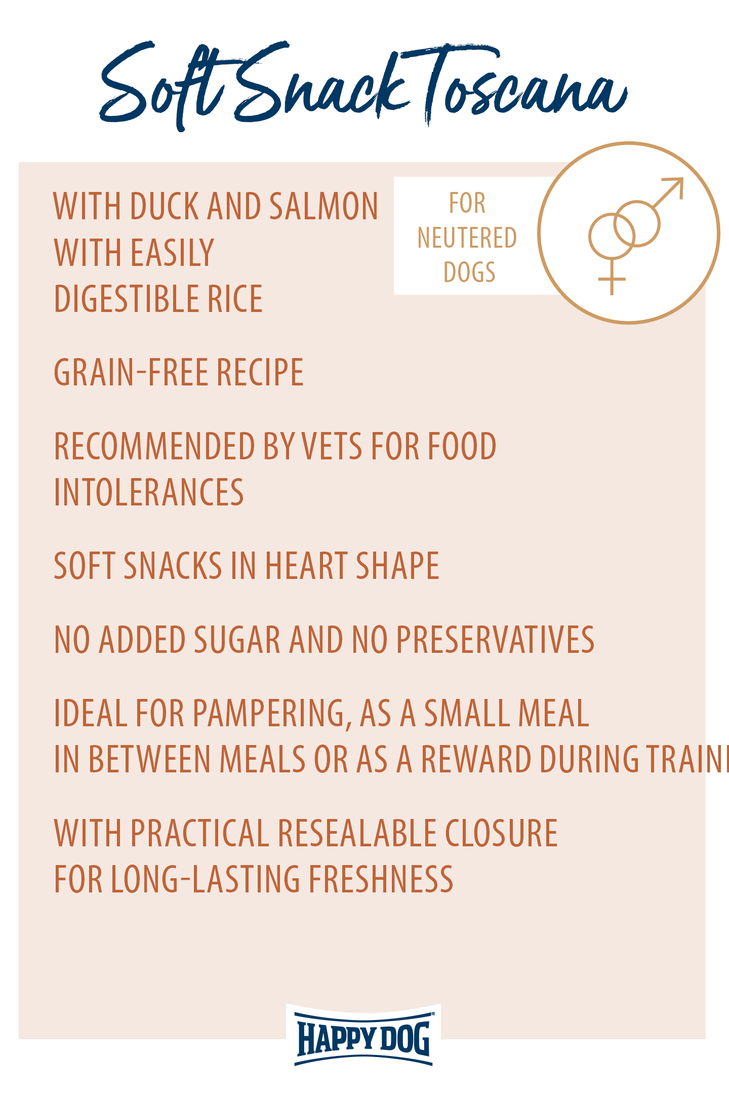 The soft, heart-shaped Snack Toscana is perfect for pampering your pet or as a little meal for in-between times. Easily digestible duck and fine salmon, enhanced with aromatic Mediterranean herbs, is a real taste experience for hard-to-please gourmet pets. The wheat-free recipe with moderate fat content is ideal for medium and large breed dogs who tend to excess weight, for neutered dogs, or for choosy dogs. These snacks are made with no added sugar and are preservative-free. The bag has a closure for re-sealing, so the snacks keep fresher for longer.