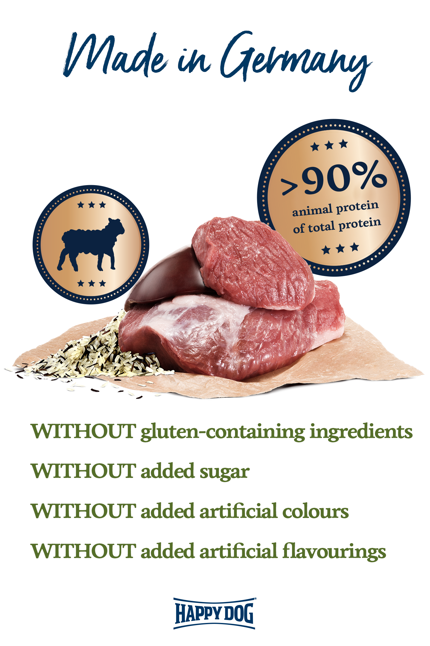 Happy Dog Sensible Puppy & Junior Lamb & Rice canned food is made in Germany from valuable lamb meat and lamb offal and contains over 90 % animal protein compared to the total protein. The recipe is gluten-free and prepared without added sugar.