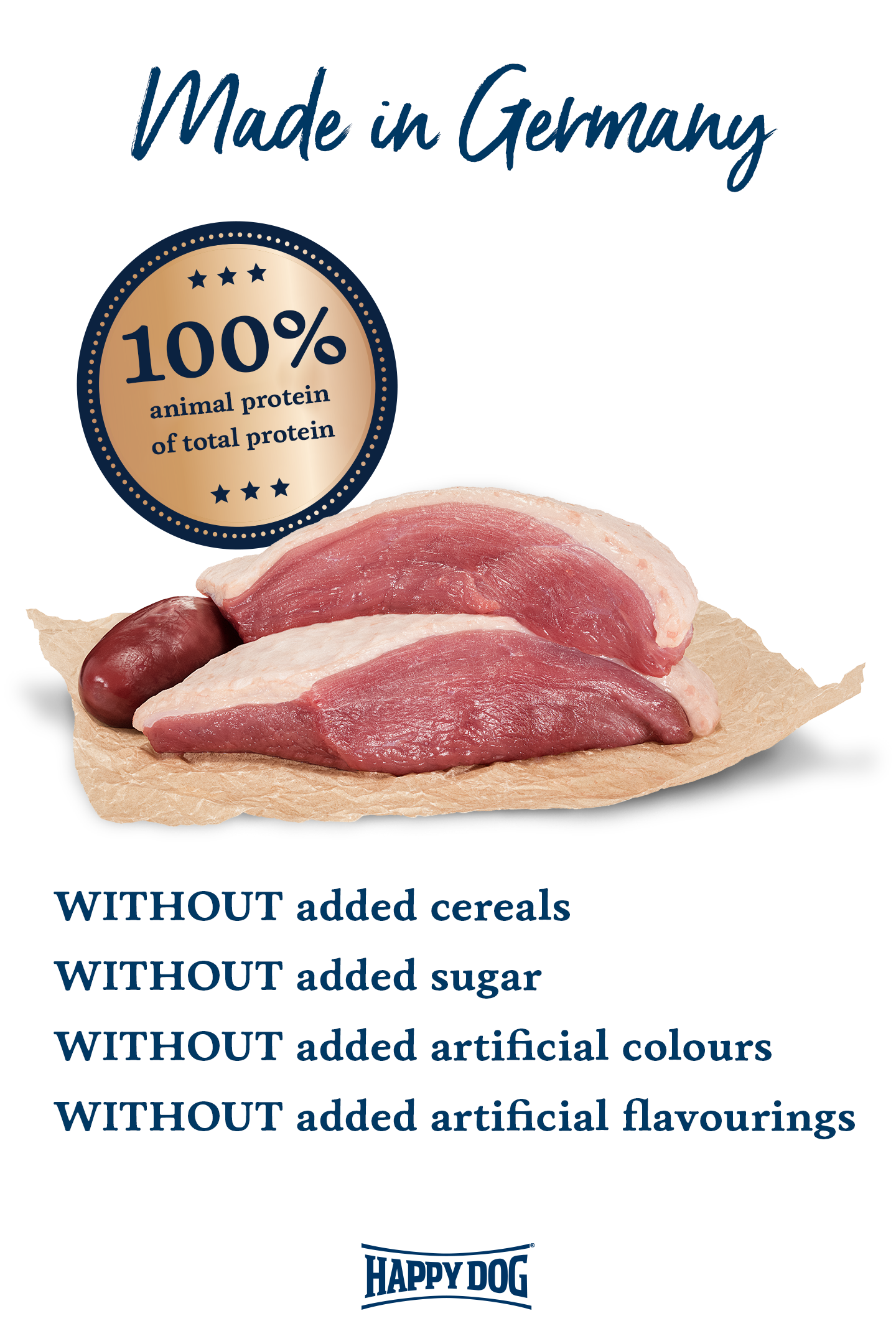 With Happy Dog Sensible Pure France premium wet dog food you are filling your dog’s bowl with pure natural goodness. Our high-quality wet food is made from 100% delicious duck and contains vital vitamins and minerals. The wet food is free from soya and other plant-based ingredients.