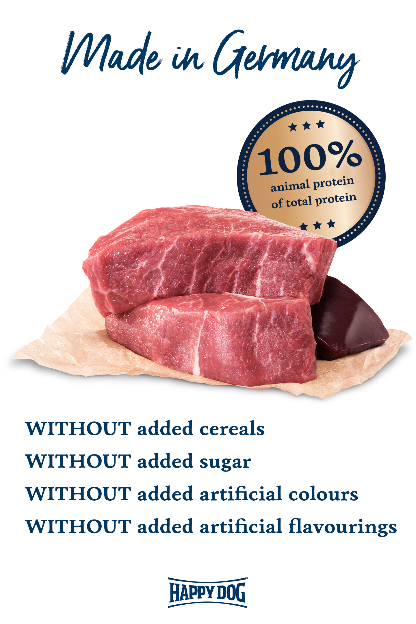 With Happy Dog Sensible Pure Germany wet food you can spoil your dog with a little piece of pure Nature. Our premium meat-based food is made from 100% valuable meat along with offal such as heart, lungs and liver. It also contains high-quality vitamins and minerals. The meat and offal come exclusively from beef*. This wet food is produced without soya or other plant-based additives.