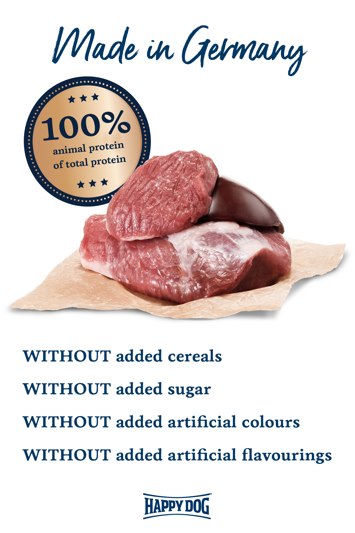 This purely meat-based food is ideal as a complete feed on its own or for owner-prepared meals. It is also perfect for combining with Happy Dog FlockenMixer cereal flakes. For a healthy diet, the cereal flakes provide important dietary fibre from vegetables to support digestion along with carbohydrates to supply energy.