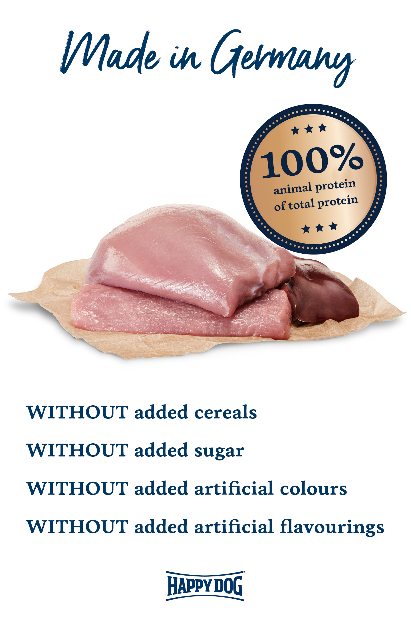 This pure meat diet is perfect as a complete food given on its own or in owner-prepared meals, and is ideal combined with Happy Dog Flakes Mixer. The Flakes Mixer provides important vegetable-based fibre for a healthy diet to help support the digestion and provide carbohydrates for energy.